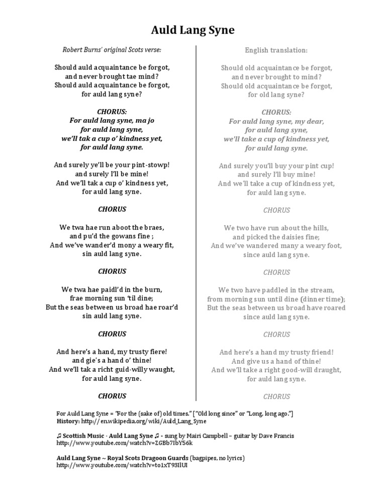 Should auld acquaintance be forgot. Does anybody really know the words? Click to see the original lyrics. The meaning and history of this new year's eve song, traditionally played and sung as midnight strikes, are also fascinating. Translation of 'auld lang syne' by robert burns from english (scots) to english.