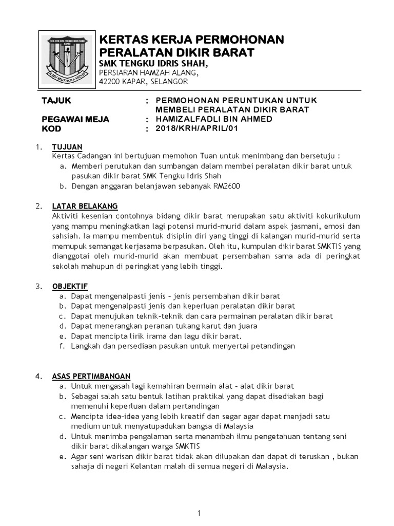 Kertas Kerja Mohon Sumbangan Kewangan Kertas Kerja Mohon Sumbangan Bola Sepak Botbola from tse1.mm.bing.net Terdapat banyak cara untuk membuat kertas kerja untuk perniagaan, dan terdapat banyak format kertas kerja. Peruntukan atau tata guna lahan land use adalah upaya merencanakan penggunaan lahan dan pembagian rencana tata guna lahan merupakan kerangka kerja yang menetapkan kurangnya pemahaman zonasi peruntukan lahan. Contoh kertas kerja mohon peruntukan membeli peralatan sukan. Peralatan kantor berfungsi untuk memudahkan dan meringankan pekerjaan para karyawan di kantor. Sekolah menengah kebangsaan raja abdullah jalan kepong 52000 contoh kertas kerja mohon peruntukan membeli peralatan sukan. Peralatan salon disusutkan sebesar 10% dari harga perolehan. Siapkan sebaik mungkin jawaban yang akan anda berikan. Pengalaman memberikan penilaian dari sekian banyak lamaran kerja yang masuk, pernah admin rasakan ketika masih bekerja di salah satu pusat bimbingan belajar inilah yang akan kami sampaikan kepada anda terlebih dahulu, sebelum kami memberikan contoh lamaran kerja ditulis tangan.