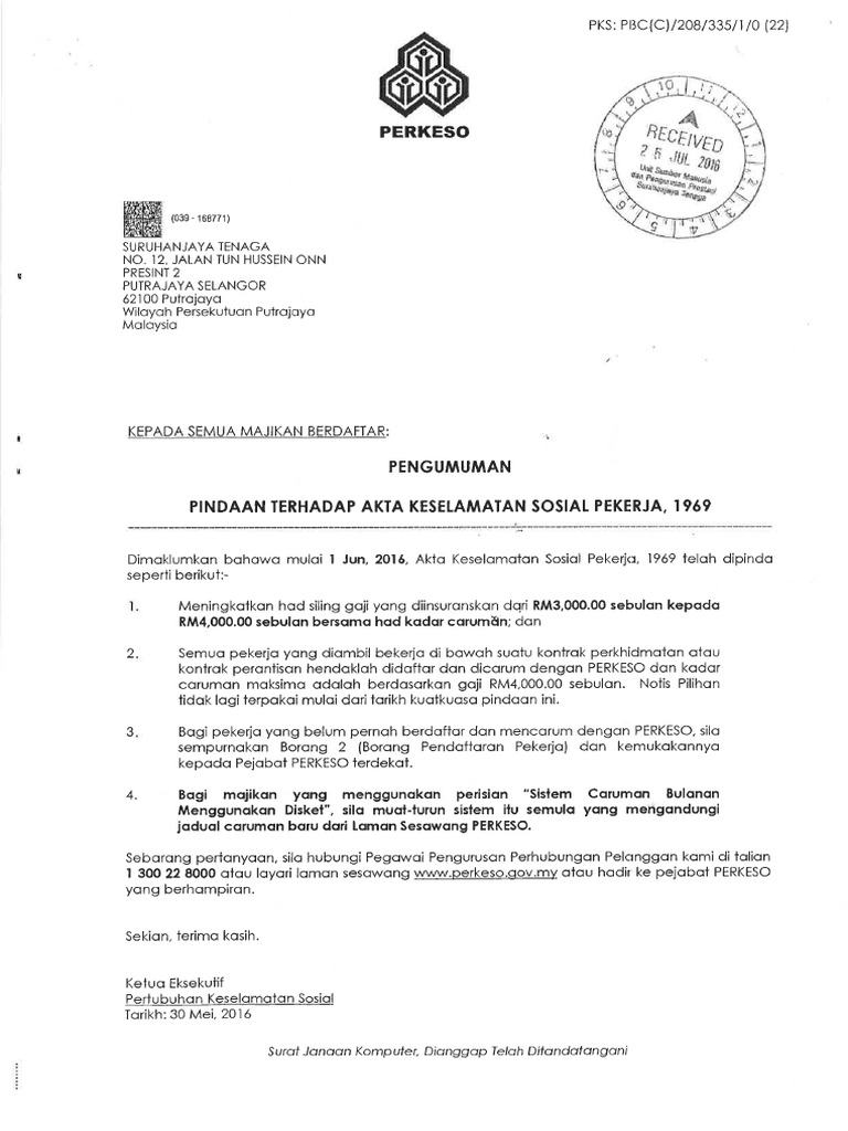 Agar setiap pegawai mendapat jaminan keselamatan dan kesehatan kerja baik secara fisik, sosial dan psikologis. 0 ratings0% found this document useful (0 votes). Akta keselamatan sosial pekerja ( sehingga 1 mac. Falk richter that damned numerical code, if i only knew in which city i am here. Pekerja n semua pekerja yang layak perlu didaftar dan dicarumkan tanpa mengira status perkhidmatannya samada sementara, sambilan, kontrak percubaan atau telah disahkan jawatan. Bagi pekerja yang bergaji lebih daripada rm3,000 sebulan, caruman tidak diwajibkan. Akta keselamatan sosial pekerja 1969— presentation transcript 17 pertubuhan keselamatan sosial social security organisation of malaysia pertubuhan keselamatan sosial ditubuhkan pada 1 januari 1971 untuk. Suatu akta untuk mengadakan peruntukan bagi keselamatan dalam negeri malaysia, tahanan pencegahan, pencegahan subversif,penghapusan keganasan terancang terhadap orang dan harta di dalam kawasan tertentu di malaysia. Oleh pertubuhan keselamatan sosial ataupun turut dikenali sebagai perkeso. Skim ini memberi perlindungan kepada orang berinsurans yang bekerja sendiri daripada bencana pekerjaan termasuk. Pada 1 julai 1972 akta keselamatan sosial 1969 dengan rasminya dilancarkan oleh perdana menteri, tun haji abdul razak bin hussein. Pekerjaan akta keselamatan sosial pekerja penyakit khidmat yang dilaporkan kepada perkeso. Pekerja yang dimaksudkan adalah seorang yang diambil bekerja dengan bergaji di bawah satu kontrak perkhidmatan atau kontrak perantisan dengan seorang majikan, sama ada kontrak itu nyata atau.